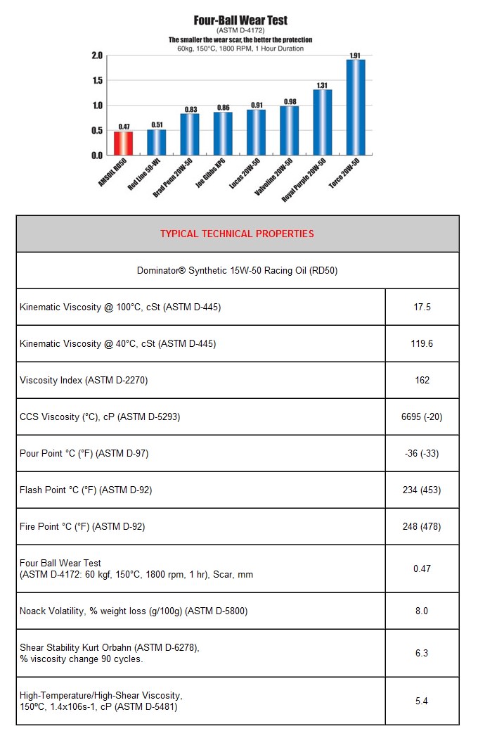 AMSOIL Dominator® Synthetic 15W-50 Racing Oil (RD50) provides superior performance and maximum protection in high-performance and racing applications. Formulated to withstand the elevated RPM, high temperatures and shock-loading common to racing applications, Dominator Synthetic 15W-50 Racing Oil delivers superior performance and maximum protection in extreme conditions. Its shear-stable formulation was engineered to provide maximum horsepower without sacrificing engine protection. Dominator Synthetic 15W-50 Racing Oil provides straight-grade protection in a multi-grade formulation.