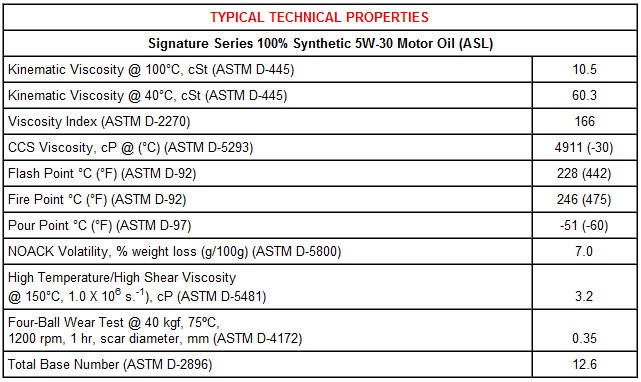 5W-30 (ASL): API SN (Resource Conserving), SM…; ILSAC GF-5, GF-4…; ACEA A5/B5, A1/B1; Ford WSS-M2C946-A, WSS-M2C929-A; Chrysler MS-6395; GM dexos1™ (supersedes LL-A-025, 6094M and 4718M) Fortified with detergents that exceed dexos1™ sulfated ash specifications.